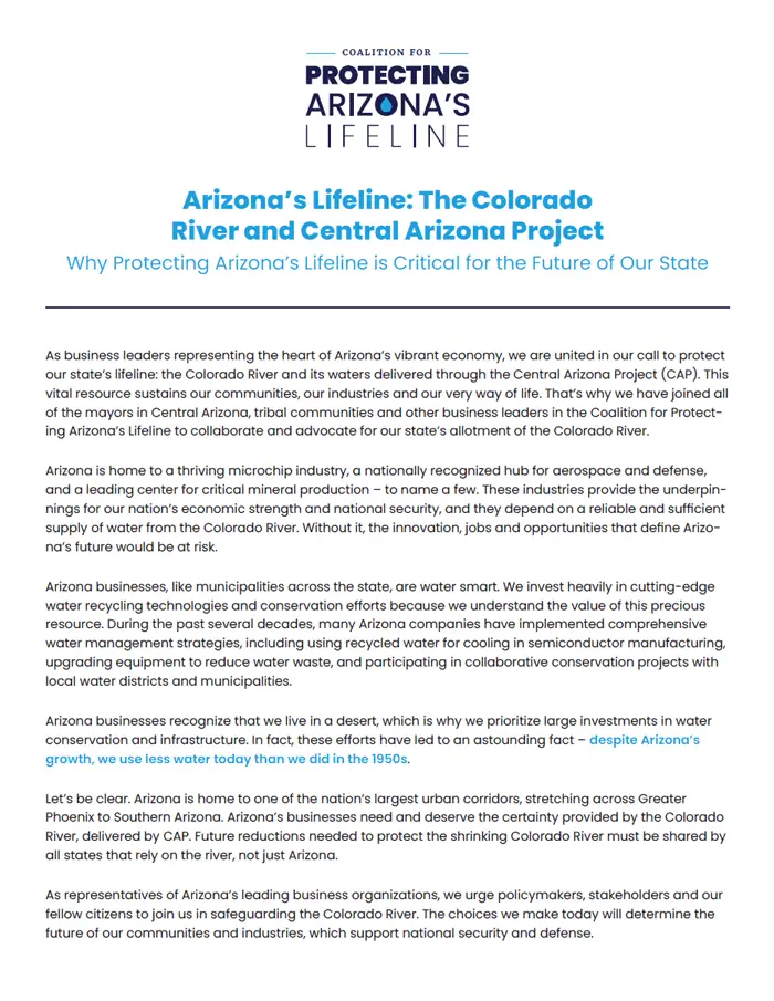 The Coalition for Protecting Arizona’s Lifeline is a nonpartisan alliance of leaders focused on educating, advocating and elevating the importance of long-term water security and economic resilience in our state.